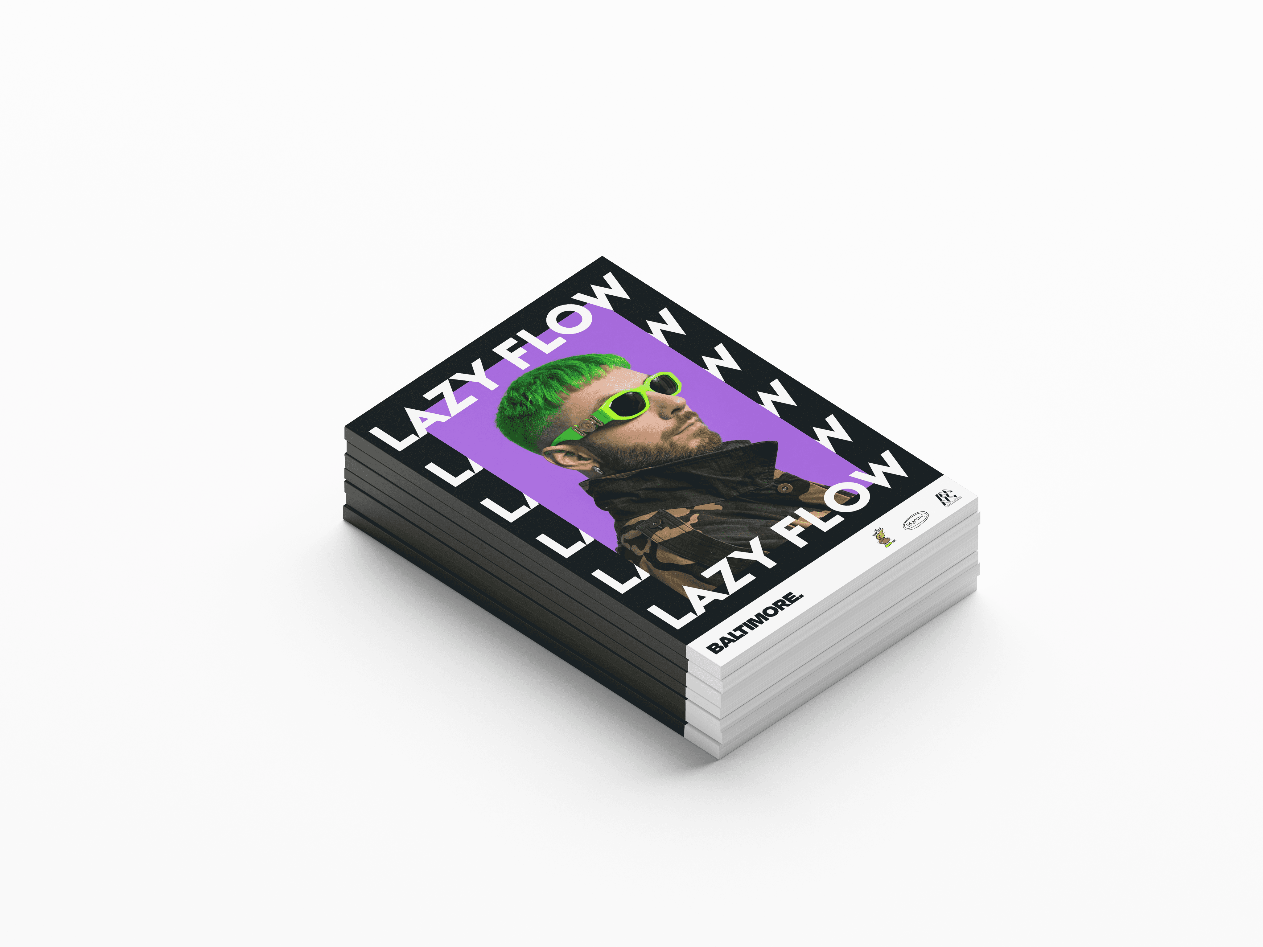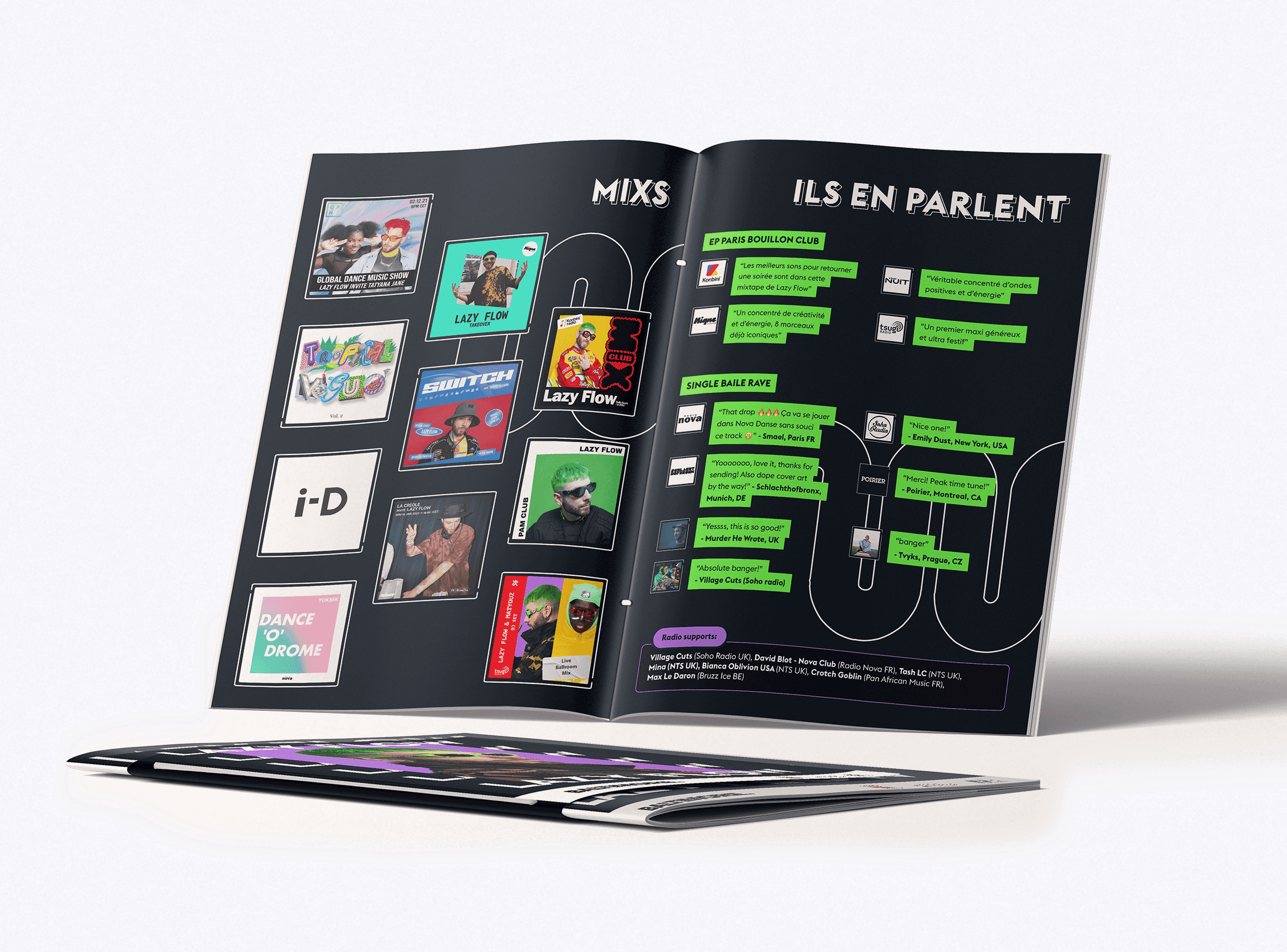 Réalisation graphique de dossiers de presse pour les artistes représentés par l’agence (Ici : Lazy Flow)